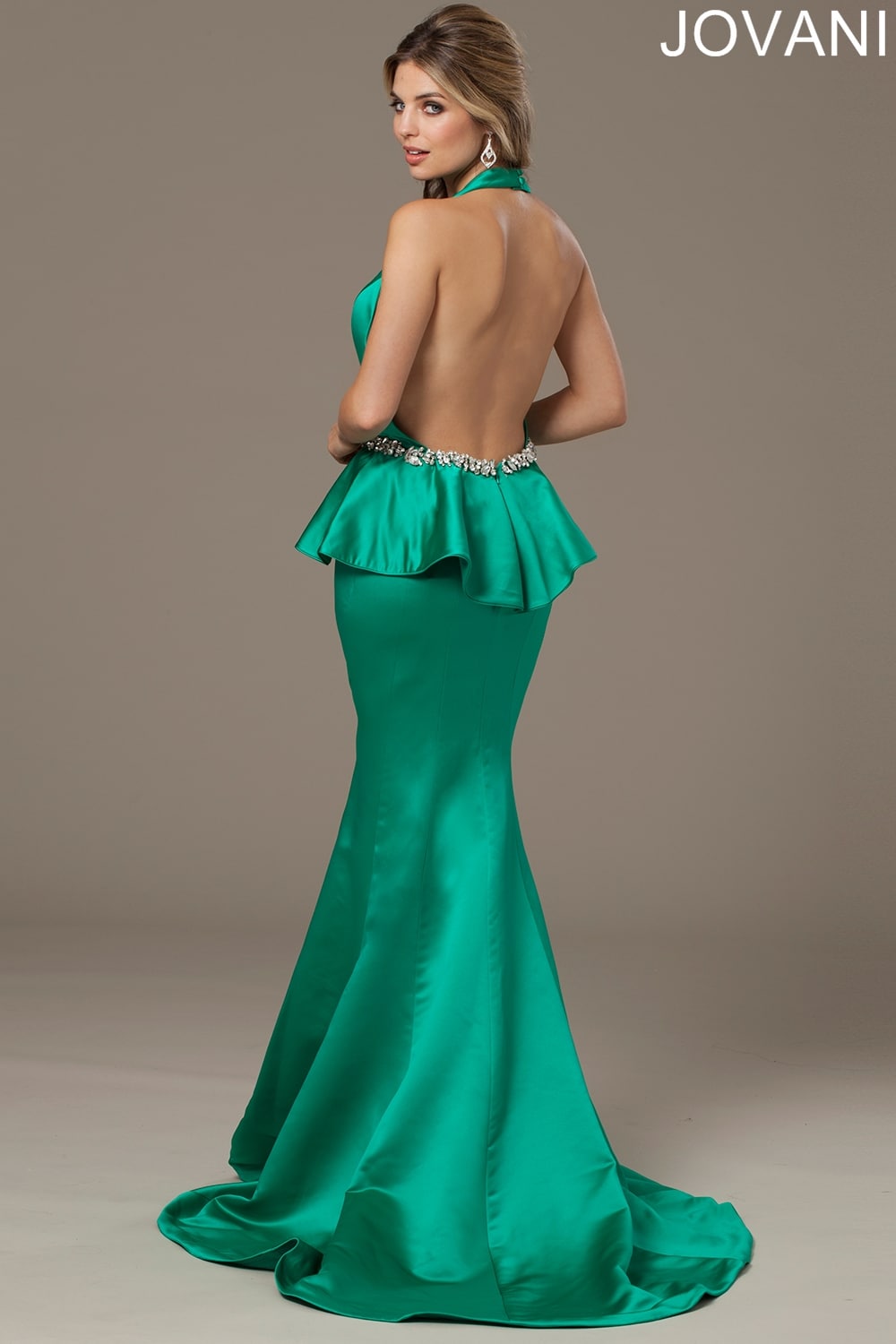 The dress is a gorgeous and striking emerald green, with a halter neck, and peplum skirt.