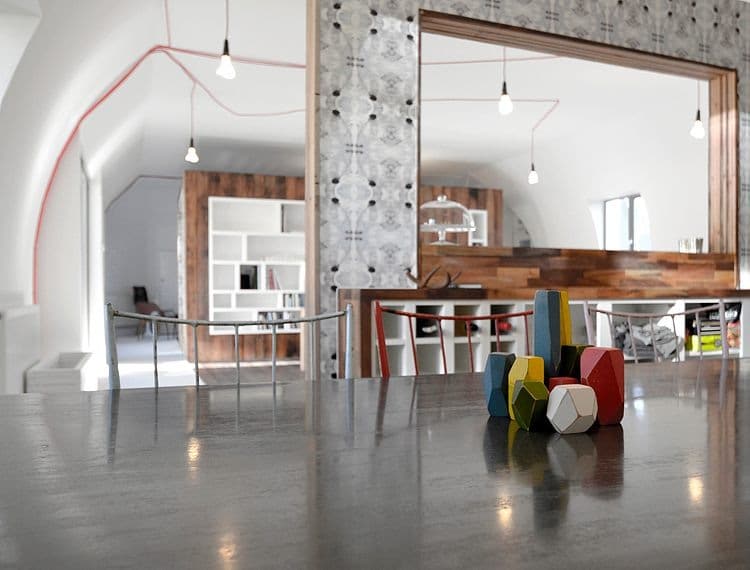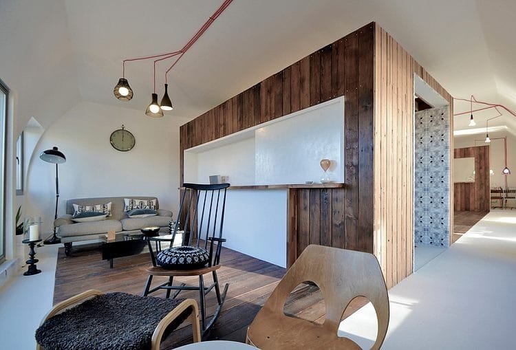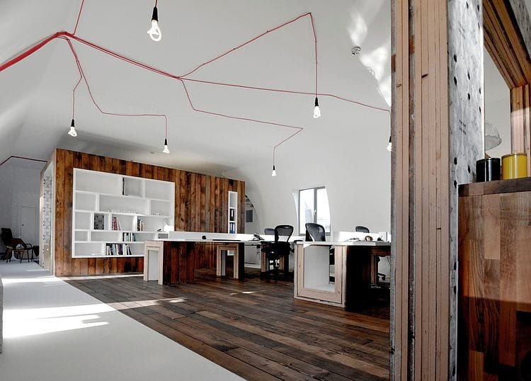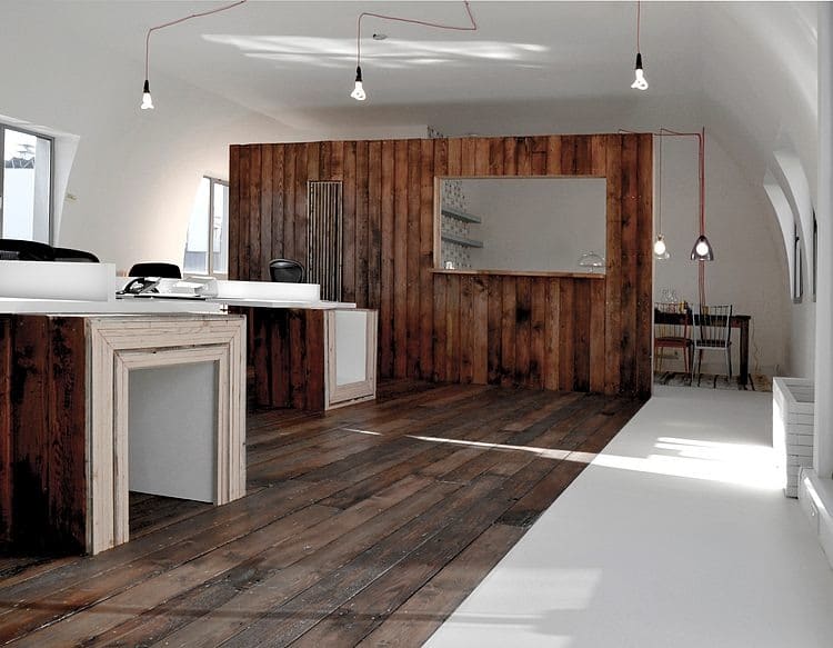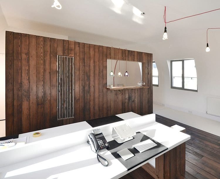 Reclaimed timber from an old Royal Air Force hangar was used to fashion the device. This material was chosen for its tactile, aesthetic qualities as well as furthering the sustainable principles of Given London. It is set in a white vinyl surround so it reads clearly as an independent element. Legs extruded from the floor of the device support bespoke white desks which extend from the walls. A series of vintage pieces of furniture and objects add another layer of texture and warmth to the studio.